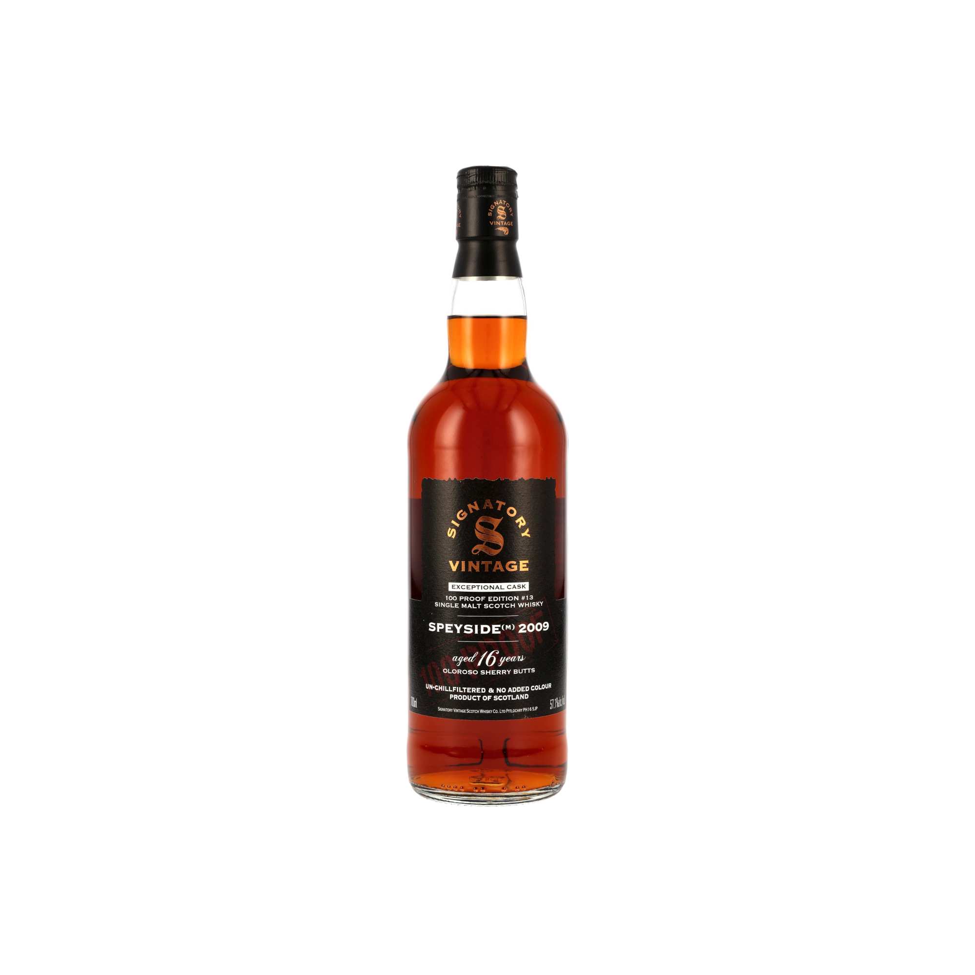 Der 16 Jahre alte Speyside (M) aus der 100 Proof Exceptional Casks Reihe mit der #13 von Signatory Vintage wurde 2009 destilliert, reifte dann 16 Jahre im Oloroso Sherry Butt und wurde 2025 mit 57,1 Vol% und ohne Kühlfiltrierung abgefüllt.