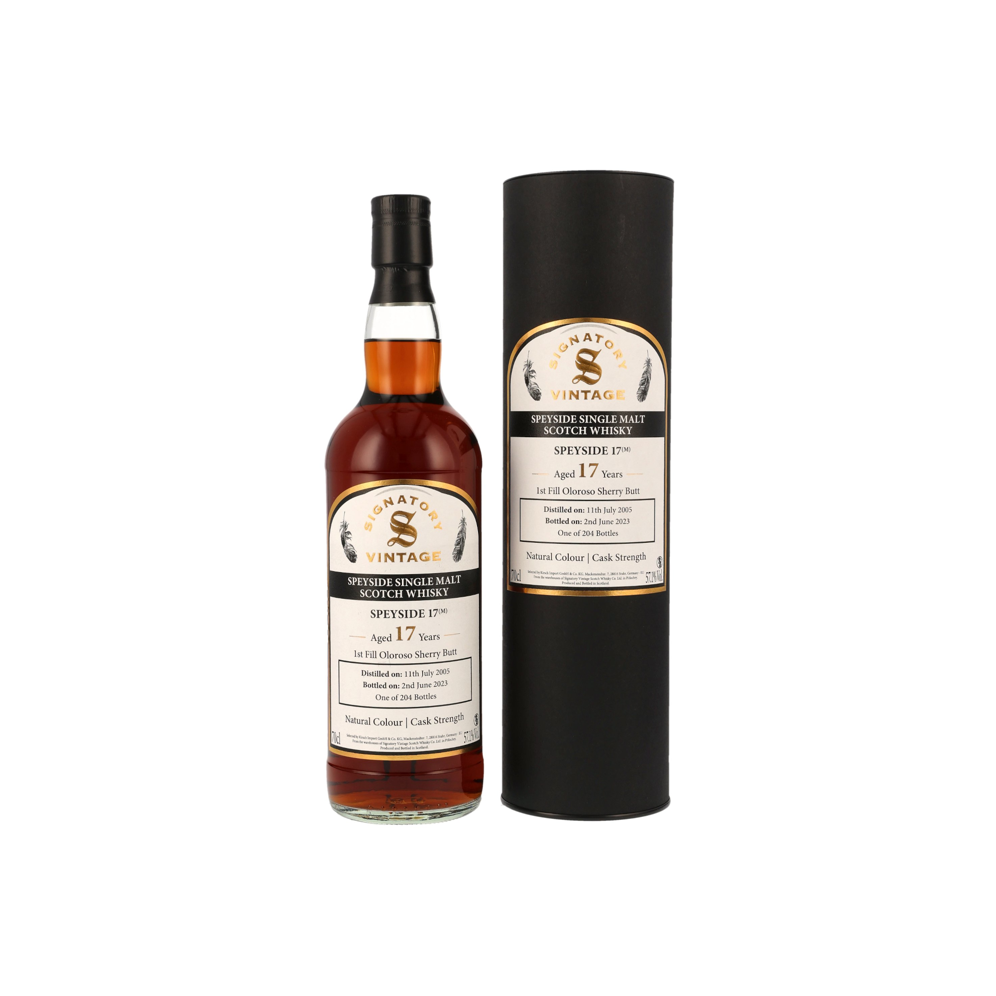 Der 17 Jahre alte Speyside (M) Signatory Vintage wurde am 11.07.2005 destilliert, reifte dann 17 Jahre im 1st. Fill Oloroso Sherry Butt und wurde am 02.06.2023 in Fassstärke mit 57,1 Vol% und ohne Kühlfiltrierung abgefüllt. Auf Farbstoff wurde wie gewohnt verzichtet.